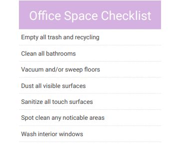 See our standard office cleaning checklist below for an overview of services provided or email us for a customized cleaning service tailored to your specific property.